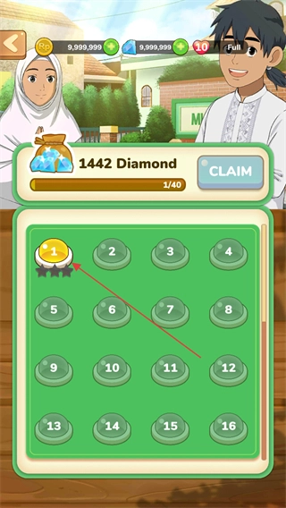 1、在关卡选择界面,点击已解锁的关卡进入游戏,同时可点击CLAIM按钮领取奖励,为后续游戏进程提供资源支持。