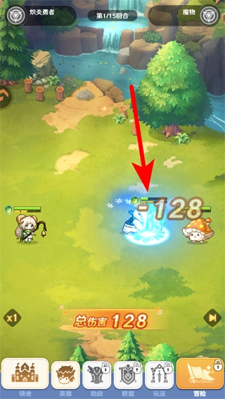 4、在战斗进行时,角色会自动释放技能对怪物发起攻击,就像图中技能造成128点伤害那样,这是推动战斗进程的核心部分,持续发起攻击直到把怪物击败,就能完成挑战并获得相应的奖励资源。