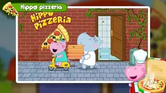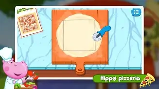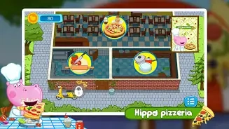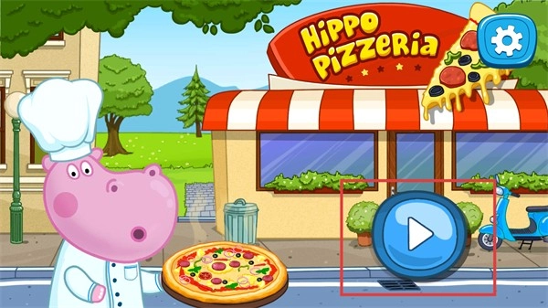 1、点击界面里的【蓝色按钮】,进入【Hippo-Pizzeria】披萨店的场景,开启制作披萨和经营餐厅的游戏流程。
