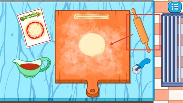 3、依照指引拿取【擀面杖】,把面饼擀成合适的形状,这是制作披萨的核心基础环节,同时结合旁边的食谱来准备后续的配料。