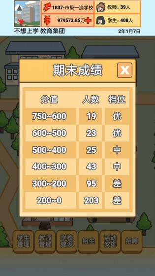 1、合理分配教学资源,确保所有班级正常运转,维持学生成绩稳定提升,考验经营思维。