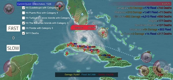 支持通过简单的轮盘控制模式来自由摧毁建筑,需要合理规划台风的移动路线以选择破坏目标。