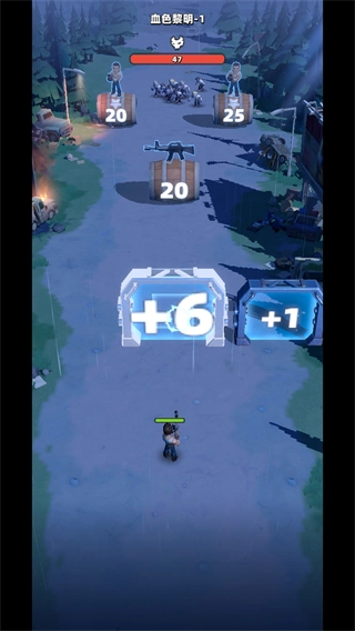 1、这是血色黎明-1关卡的初始战斗界面,移动角色获取标有+6的增益道具可获取战斗加成,为后续对抗敌人积累优势。