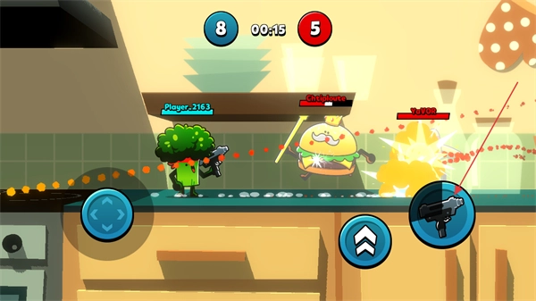 1、在该厨房对战场景中,通过左侧方向键操控角色移动,借助跳跃键调整角色位置,为后续与敌方单位的对战做准备。
