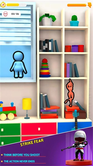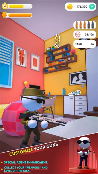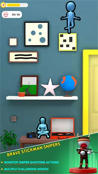 不同关卡的房间布局各有特点,融入了书柜、背景墙、厨房等各类元素,这些布局既丰富了视觉感受,又会对狙击视角和目标隐藏位置产生影响,让闯关过程更具多样性。