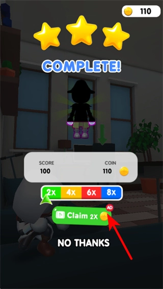 3、关卡完成后,点击Claim 2x按钮可获得双倍奖励如金币,积累更多资源用于解锁新武器或提升角色能力。