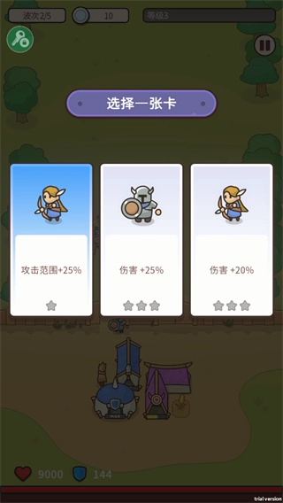 1、在选择一张卡界面选增益卡,如下一波所有单位和设施伤害+30%,强化防御能力。
