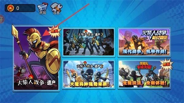 1、打开火柴人奇袭的游戏界面,这里面有多种不同的玩法,找到经典的火柴人战争:遗产模式并点击进入。