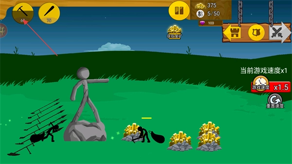 2、点击左上角的按钮可以花费金币召唤出阵营的火柴人,进行挖矿和进攻等操作。