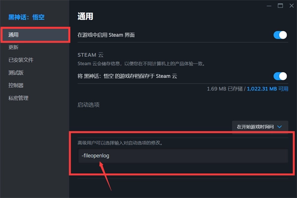 5、在Steam平台内,右键点击《黑神话:悟空》,选择“属性”,进入“通用”标签页,找到“启动选项”区域,在下方标注“高级用户可以选择输入对启动选项的修改”的输入框中,输入“-fileopenlog”。
