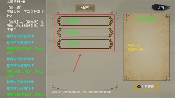 在发展宗门的过程中,玩家可以尝试从其他宗门挖掘优秀人才,进一步增强自身的力量;与实力强大的势力结成同盟,为宗门的生存提供保障;也能够主动挑战其他门派,掠夺他们的资源来壮大自己。不过,在掠夺他人的同时,也要时刻警惕对方可能发起的反击,做好应对准备。1、前往【仙市】获取【储灵器】、【结金丹】、【含光剑】等各类道具,这些道具可用于增强弟子实力,同时为宗门建设积累必要的资源储备。