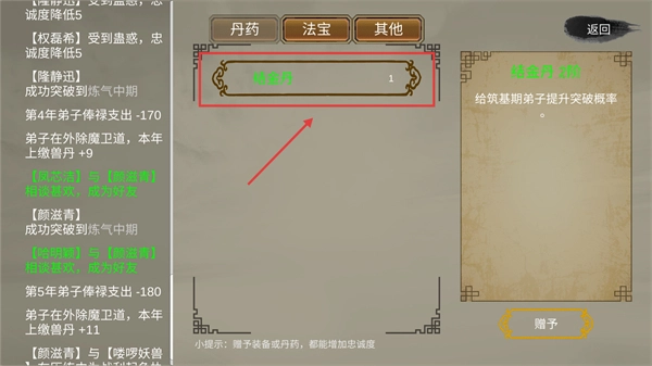 3、借助【结金丹】提升筑基期弟子的突破概率,帮助他们突破瓶颈,以此稳固宗门整体实力的根基。