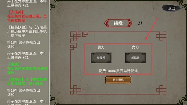 4、借助【结缘】系统促成【权磊希】与【颜滋青】结为道侣,以此强化宗门内部的凝聚力,并提升其传承性。