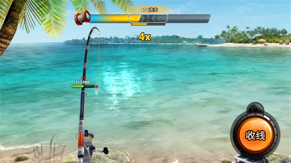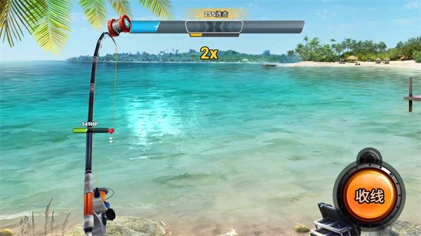 3、接着需要点击收线操作,使钓线的张力始终保持在中间位置,若是张力过高或者过低,都会导致无法成功钓上鱼。