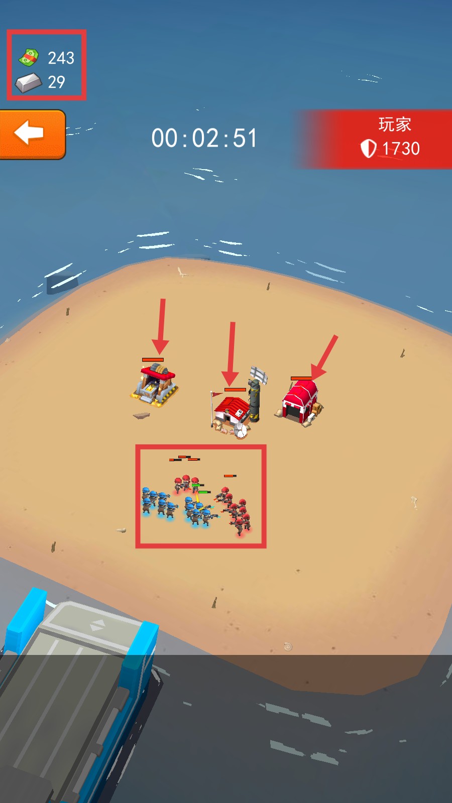 2、留意资源数量有助于我们制定战斗策略,在判断局势占优后,调遣士兵攻打敌方建筑,推动战局发展。