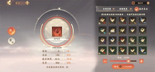 3、「极」以下的灵器,「强化」可以提升灵器等级,加强灵器主灵韵的数值。