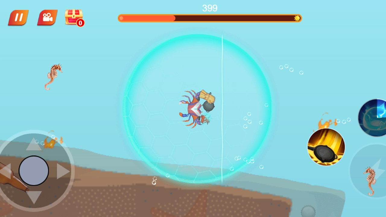 最强大螃蟹是一款轻度休闲动作类游戏。游戏开始时,玩家认领一只螃蟹,操控它破坏锅中的葱姜蒜,然后跳出锅来到海洋。进入海洋后,螃蟹会与各种海洋生物展开对战,在此过程中,它有机会击碎海洋里的特殊物体,进而获取武器和铠甲。