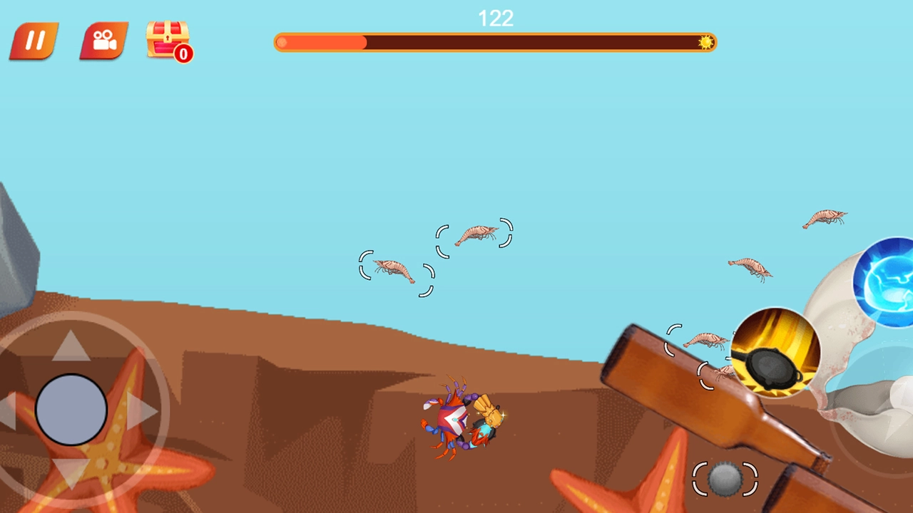 3.控制摇杆走位你的螃蟹,吃掉水里的食物,就会变大