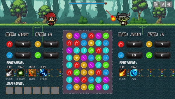 2、三个颜色相同的小球消掉之后,角色就可以获得相应的技能,这些技能可以攻击右边的小怪物,玩家注意收集更多的技能使用,提升实力,才能不断的冒险,消灭更多强大的角色了。
