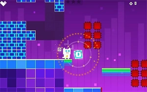 蓝色?可以顶,出现提示,然后继续沿着箭头前进。下来,隐藏通道中碰到机器人,机器人自动移动,借助机器人跳的更高,上去。跳上去,碰到黄色喵星人,得到一个技能——子弹,技能有cd。往前走,用子弹清扫前进中的障碍物,上面吃到第一个星星。存档点,打开机器人旁边的障碍物,机器人走下来,借助机器人跳上去。吃到第二个星星。用子弹推动封路的障碍物,借助这个障碍物跳到右边。跳上去,左走吃到第三个星星。往前前进,过关。