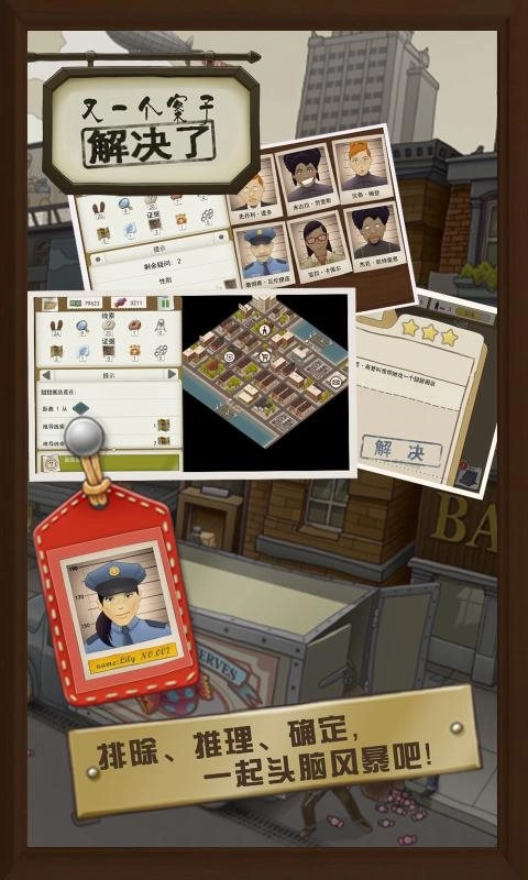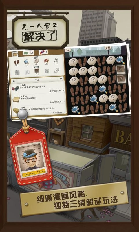 又一个案子解决了是一款解谜类手机游戏,采用漫画风格设计。复古的色调搭配怀旧的人物服饰,很容易让人联想到福尔摩斯所处的时代。在游戏里,玩家将化身私家侦探,为身边的人一桩桩离奇案件,搜寻线索、指证嫌犯、查找物证等经典解谜元素都能在其中找到。