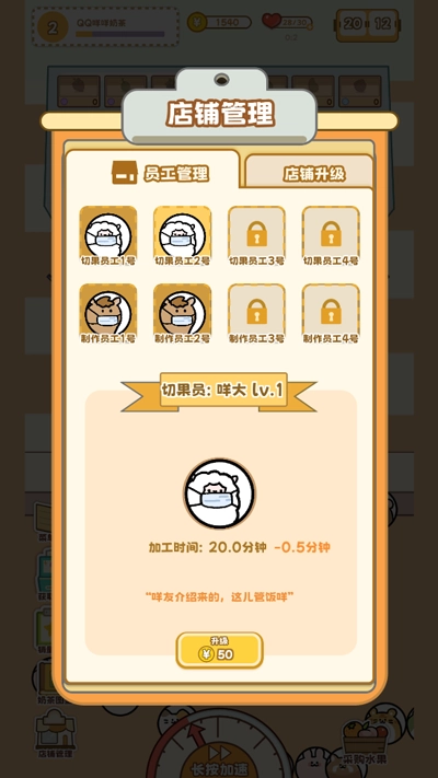 1、玩家作为奶茶店的老板,必不可少的就是需要招募员工来经营奶茶店了!那么如何获得更多的员工,提供收入呢?当然是升级店铺,店铺级别越高,招募的员工就越多哦!