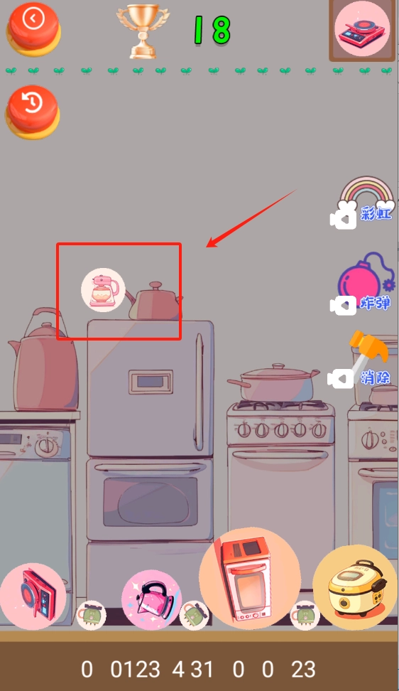 观察厨具图标和对应的数字,点击粉色水壶来完成合成操作,右侧的消除道具可以辅助你通关。