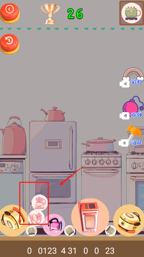 点击红框里的厨具图标进行合成升级,还能借助彩虹炸弹这类道具来辅助,顶部会显示当前的分数。