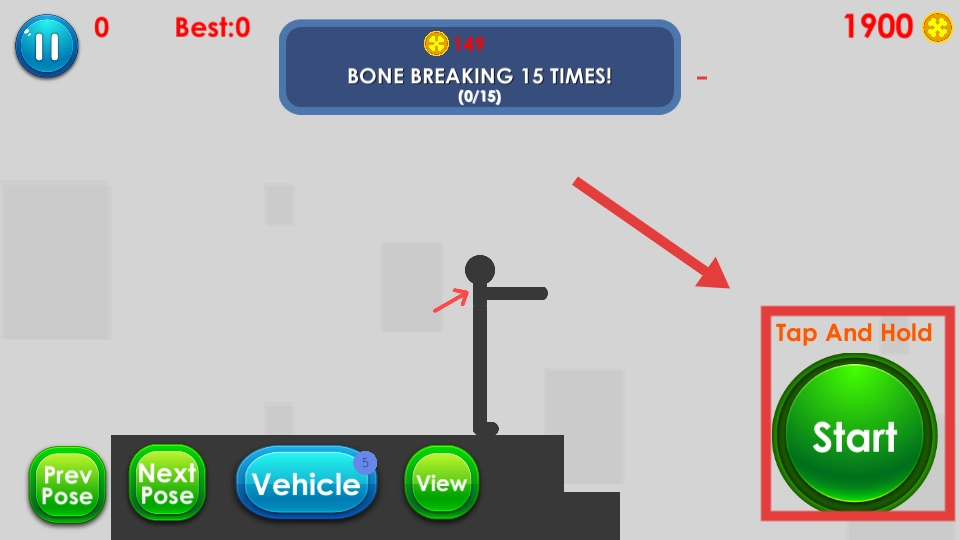 控制火柴人在阶梯地形移动,让它通过坠落、碰撞等方式受到伤害,完成骨折次数的目标,要是需要重新尝试,点击Reset按钮即可。