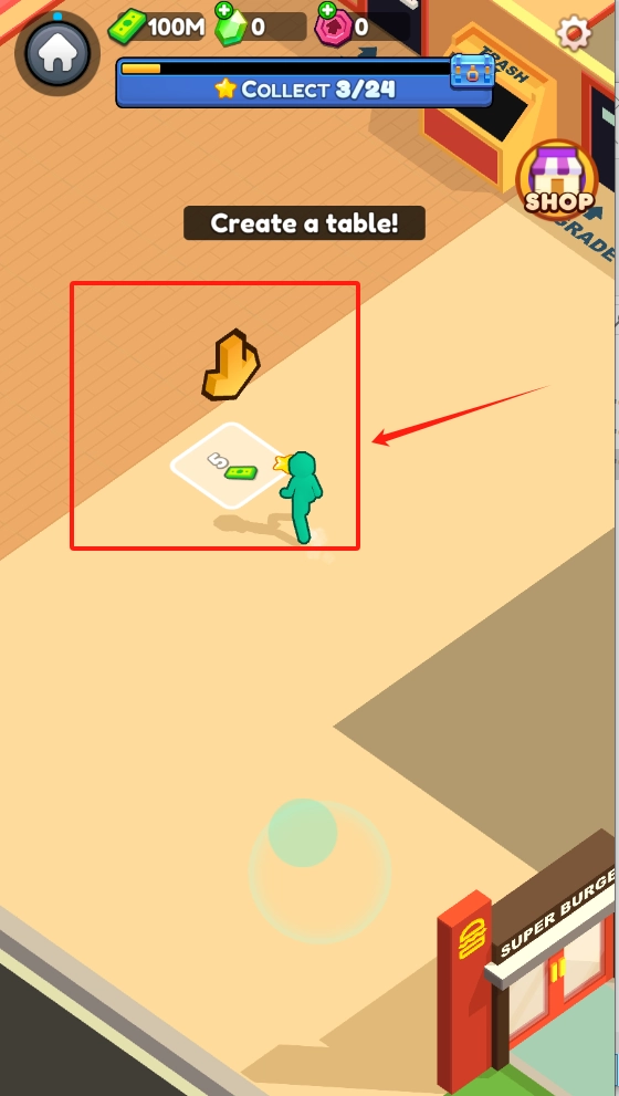 下方有个创建桌子的按钮,按照手势提示点击道路区域,通过经营汉堡店来完成收集任务。