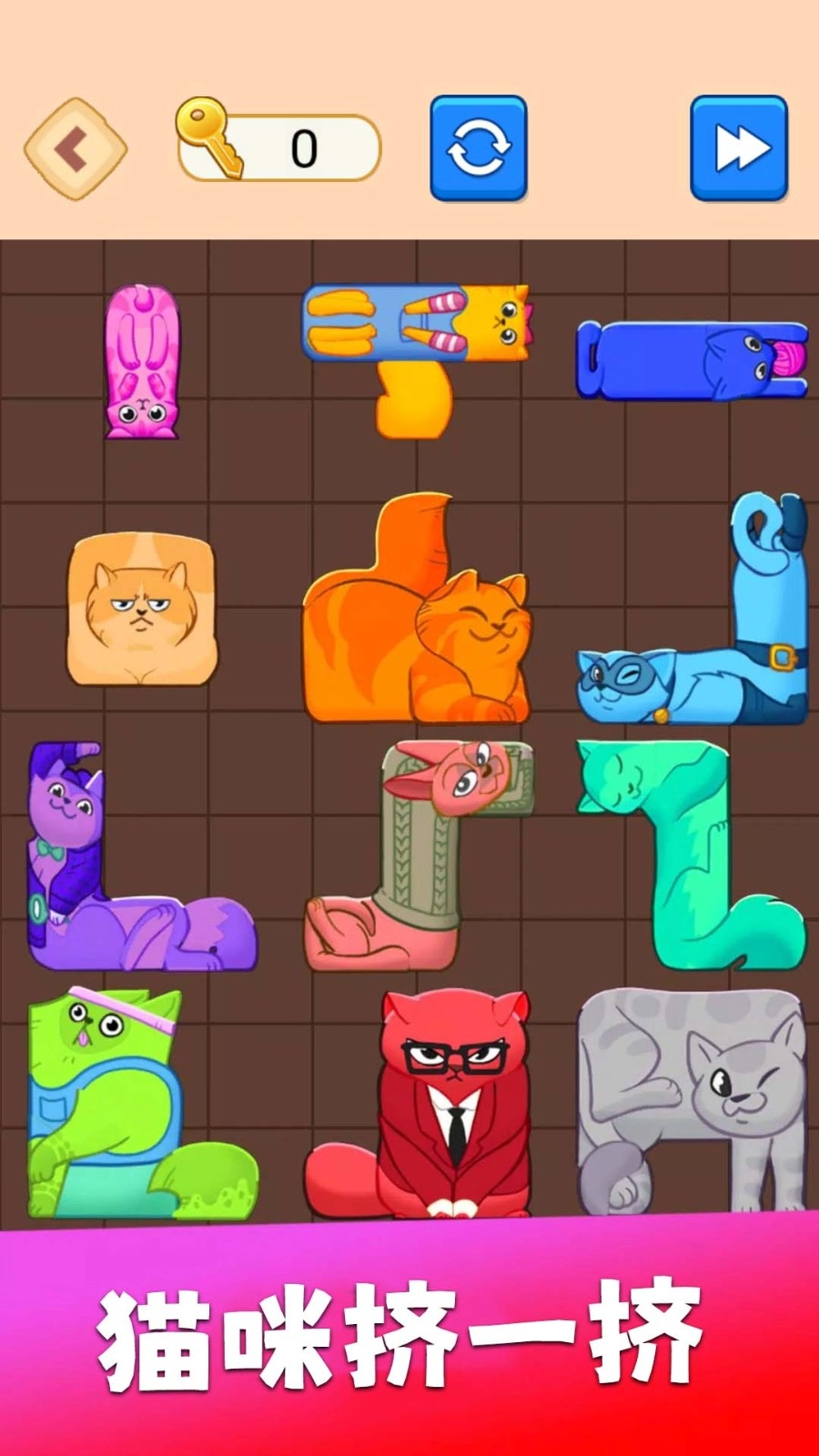 有限的时间内,合理规划挤猫咪的顺序尤为重要,轻松的放置,帮助您快速的闯关。