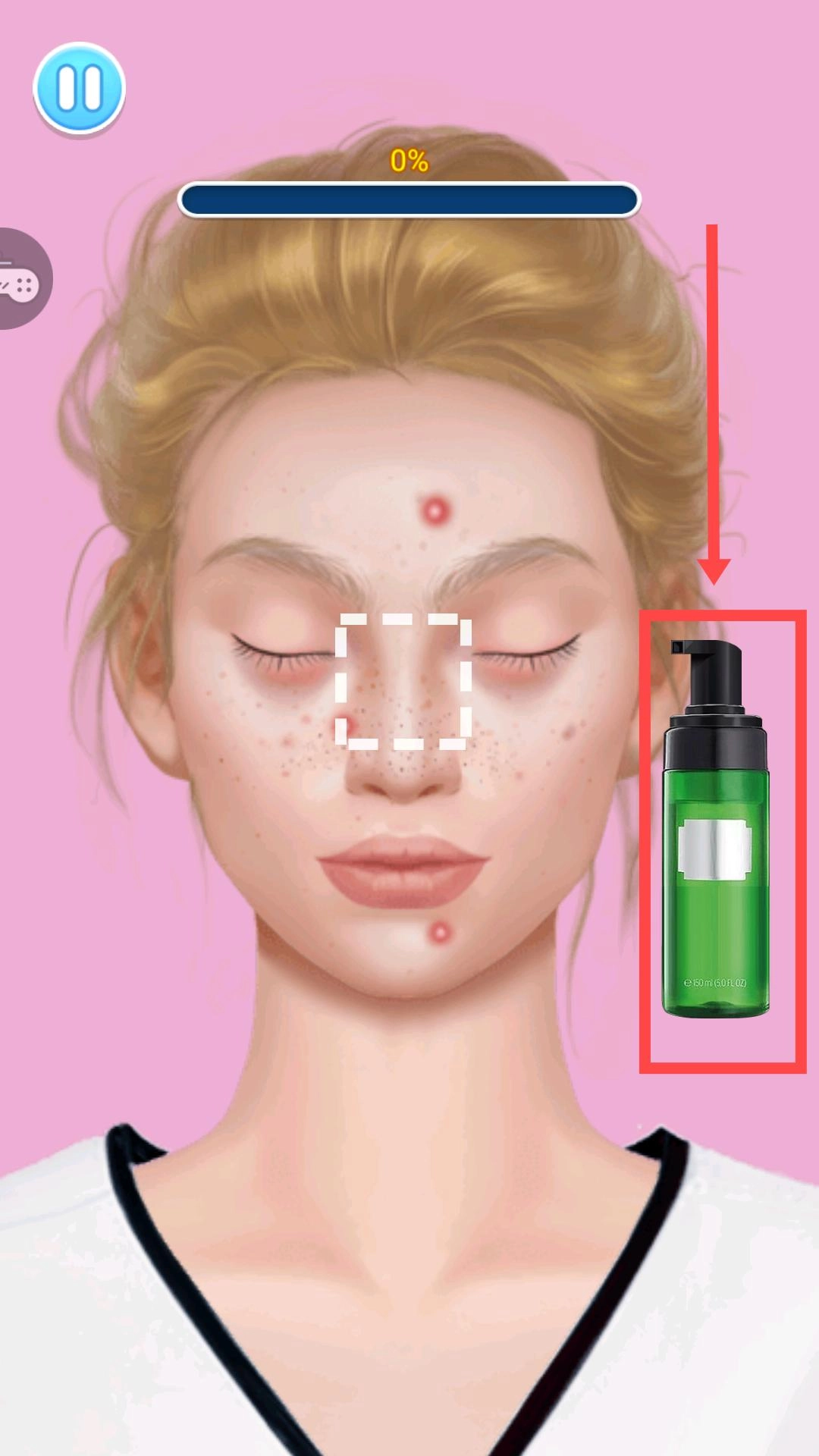 在美妆步骤中,依据面部存在的问题,点击右侧的绿色洁面产品,把它用在脸部需要清洁的区域,以此清除肌肤里的杂质。
