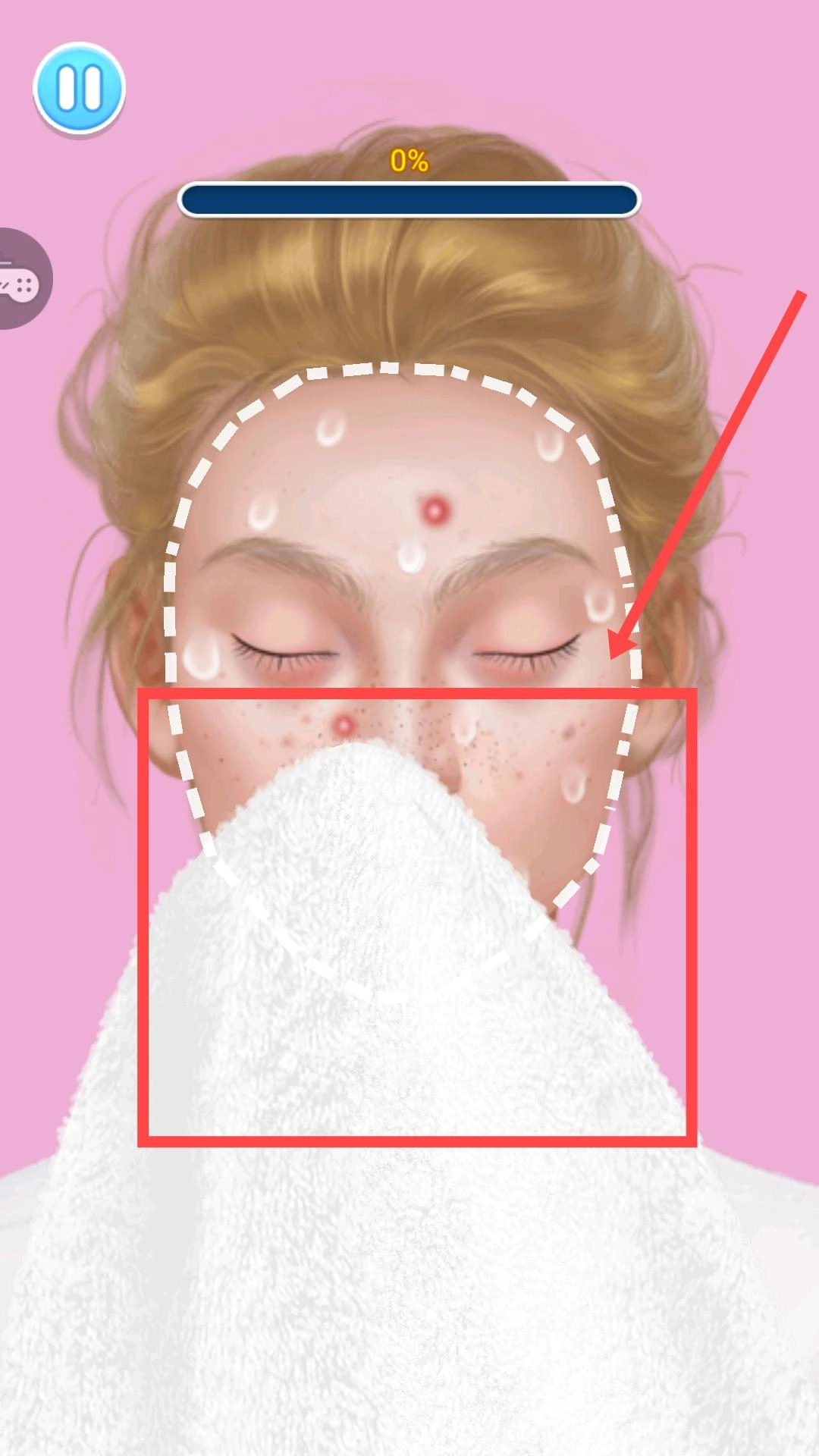 洁面后,取白色毛巾道具,覆盖脸部相应区域进行擦拭,完成清洁环节,以推进美妆改造流程。