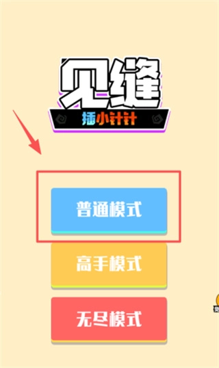 游戏模式选择界面设有三个难度入口,蓝色矩形对应普通模式,黄色矩形可开启高手挑战,红色矩形能启动无限循环的无尽模式,标题区的红色箭头持续闪烁,以此提示操作的起点。