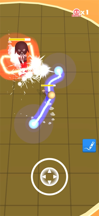 1、在虚线框内绘制一把激光剑,具体造型没有限制,玩家只需用手指操作就能顺利完成画线;拖动下方轮盘让武器与敌人碰撞,若对绘制效果不满意,可点击右侧按钮重新绘制,借助武器消灭对手。