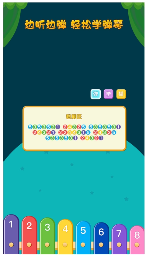 3、游戏加入了独有的“学”“弹”“播”功能,可以让宝宝根据提示进行弹奏,通过播放功能收听完整的旋律,可以进一步增加宝宝对乐感和声音的辨别能力,变得越来越聪明。