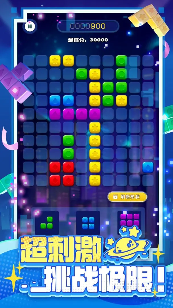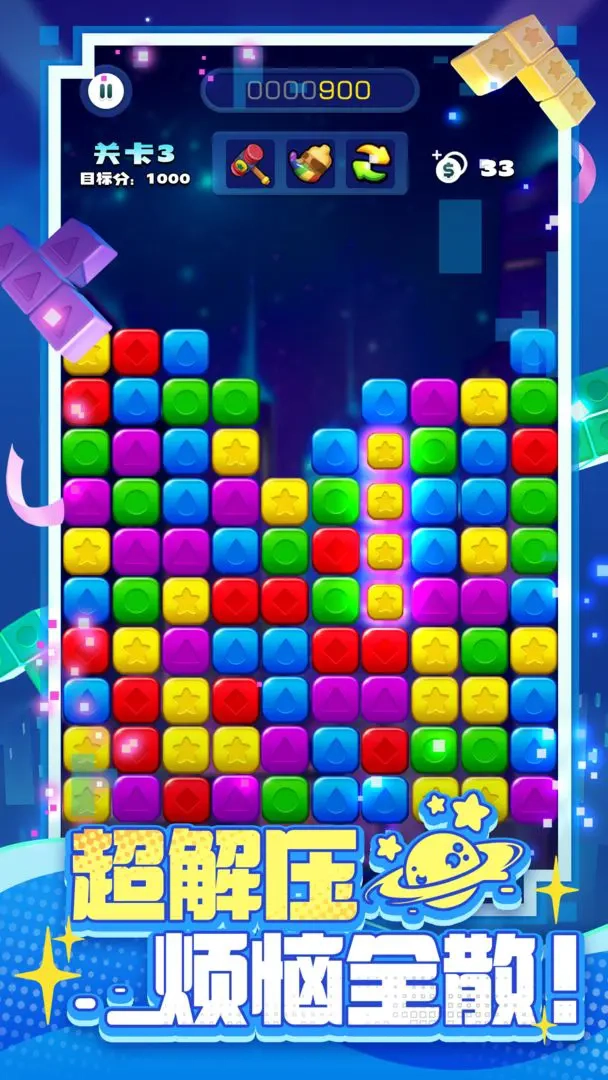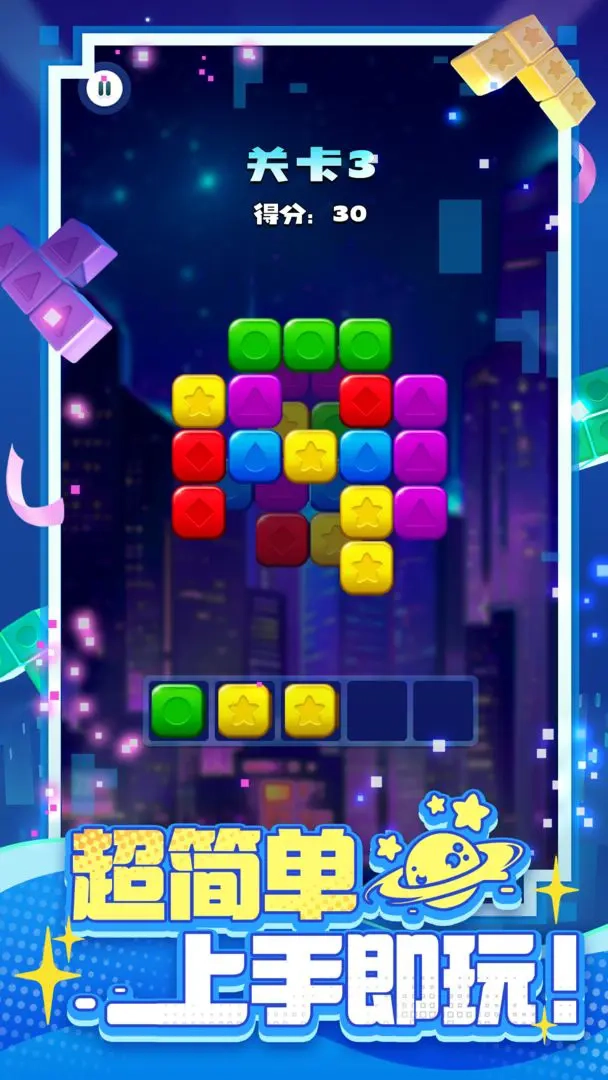 点击2个或更多颜色的星星方块即可消除,同色的星星方块越多,得到的分数越多,上手毫无压力。