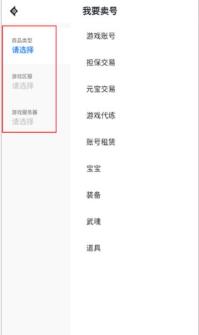3、选择商品类型、游戏区服、游戏服务器等信息