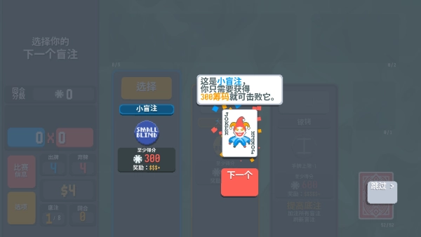 1、打开小丑牌等离子模组,开始游戏,你的目标是赚取筹码以击败敌方的盲注,下图是小盲注,你只需要获得300筹码就可以击败它。