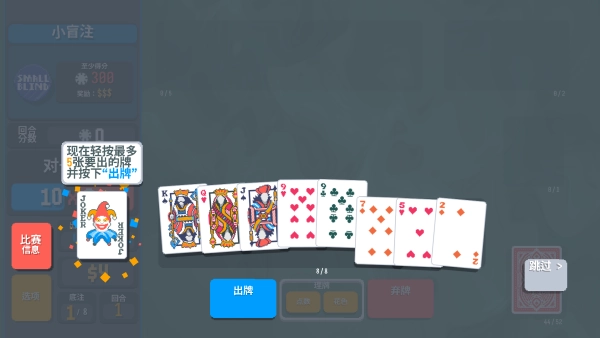 6、每回合你的出牌次数和弃牌次数都是有限的,在使用所有出牌次数赚取300筹码来赢得此回合。