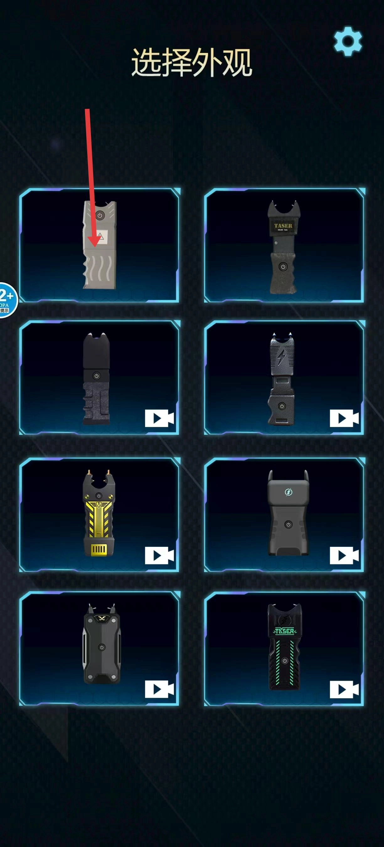 进入佳作界面后,浏览展示的各类脉冲电击器外观,点击自己喜欢的款式,让它被蓝色边框选中,这样就完成了外观选定的操作。