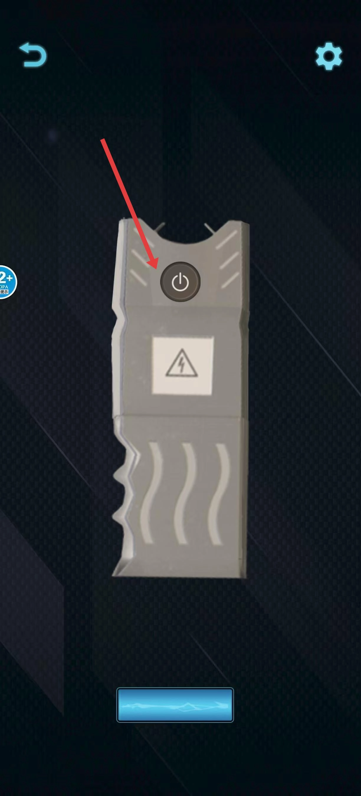 进入已选定外观的详情页面后,找到电击器上方的电源按键,点击此按键,即可触发后续与电量相关的交互流程。