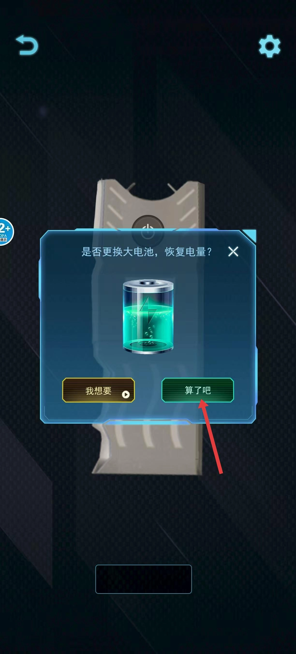 当弹出是否更换大电池以恢复电量的提示框后,可依据自身需求进行选择;若不愿更换,点击绿色的“算了吧”按钮即可关闭提示框,继续使用设备。