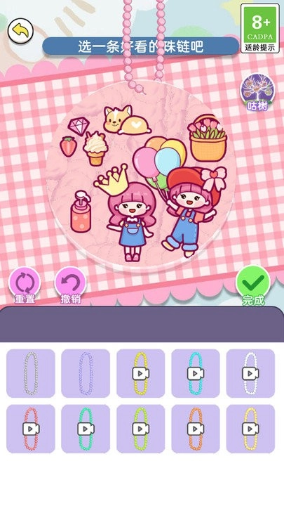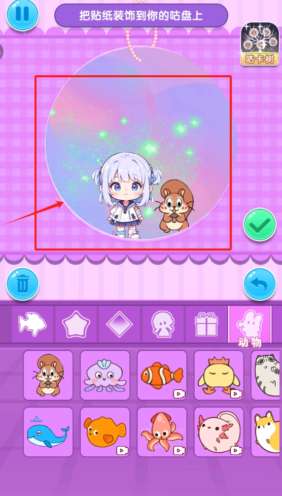 中间红色框选的是贴纸底板,你可以用右侧的贴纸来装饰咕盘,要是操作错了,左下角能撤销或者删除已经选好的贴纸。