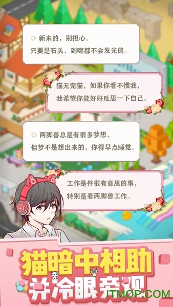 【游戏背景】 游戏主角李废柴一直怀揣着建造一座旅馆的梦想,起初这不过是遥不可及的白日梦。然而,在他那只名为“猫BOSS”的猫咪时而暗中相助、时而犀利嘲讽的奇妙推动下,李废柴竟一步步脚踏实地搬砖劳作,朝着实现梦想的方向慢慢靠近……