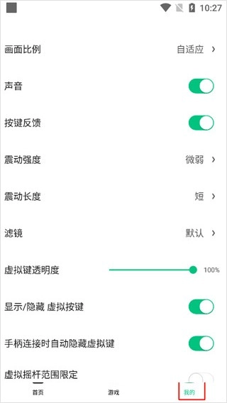 2、自定义调整画面比例、声音、振动强度、显示或隐藏虚拟按钮等;