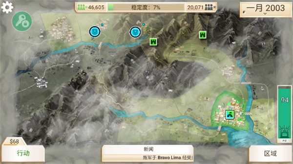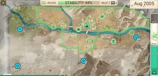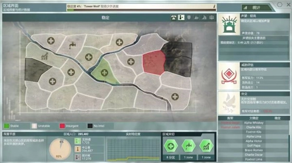 进入游戏后,你的军队需在当地驻扎并持续扩充实力。操作菜单设有概览、平民、政府和军队四个选项,你要获取资金以维持政府运转,建设水电、医疗、交通、通讯等基础设施来提升经济发展水平与当地人支持率,同时还需防范腐败,避免内部生乱。