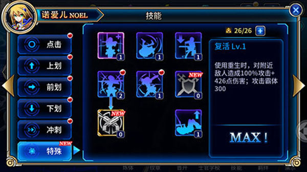 玩诺爱尔这个角色时,玩家除了“练体”外,其他技能最好都点满。诺爱尔的羁绊效果是:白面提升攻击,松鼠增加血量,男主则是攻击和血量各加一半。由于前期技能点非常紧缺,且羁绊加成是对应角色的相应属性,所以羁绊等级得跟上,装备强化也要同步进行,纹章也应升级到对应属性(前期资源尤其金币很紧张)。比如白面能增加诺爱尔的攻击,那纹章就点魔素(长按可自动升级,经验瓶的使用也是如此),装备方面,紫装就可以开始强化了,之后直接把强化过的紫装喂给橙装,强化等级能完美继承。不过强化过程中金币消耗很大,所以建议前期如果有条件,VIP礼包里的金币一定要买哦。