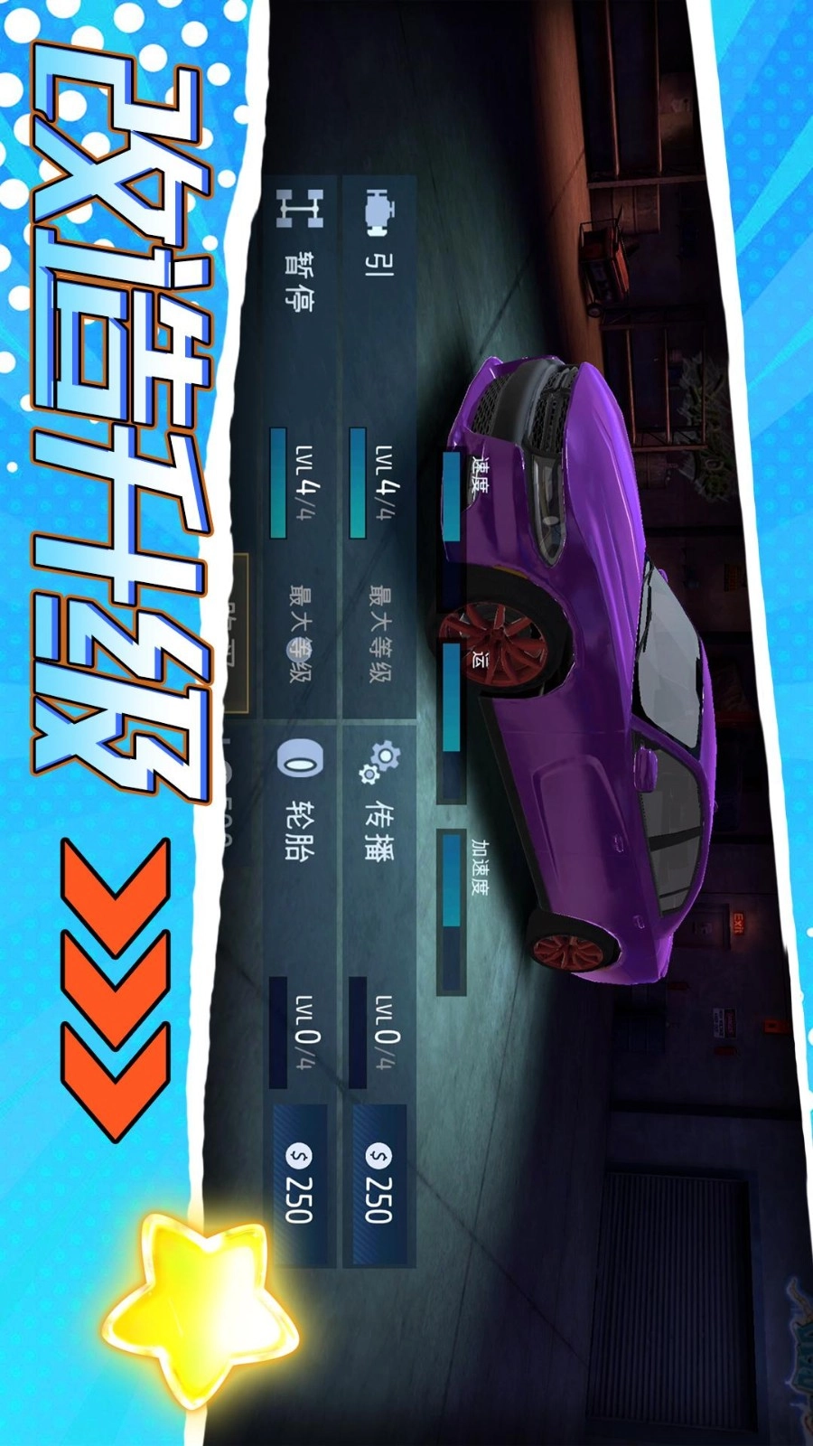 丰富的游戏赛道选择,游戏的难度也会不断的升级,自定义车辆,完成性能升级。