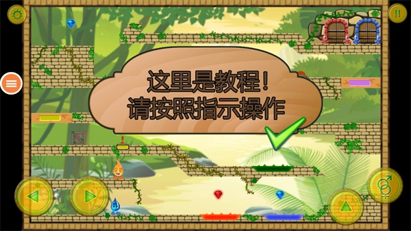 游戏里左下角的按键能控制角色前进和后退,右下角有两个按键,一个用于切换冰与火角色,另一个是跳跃功能。初次游玩时会有新手教程,跟着提示完成关卡就能熟悉整个游戏流程。